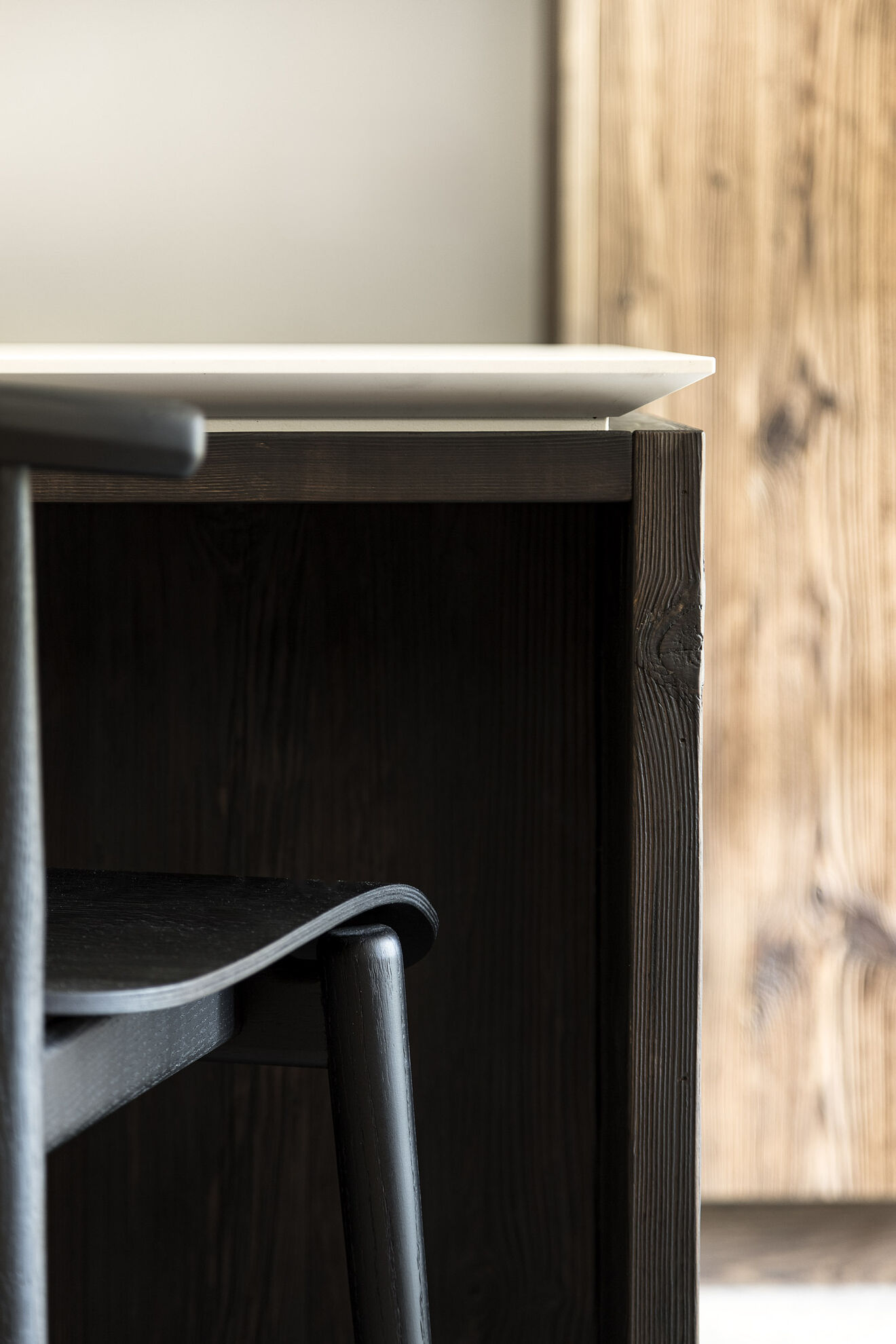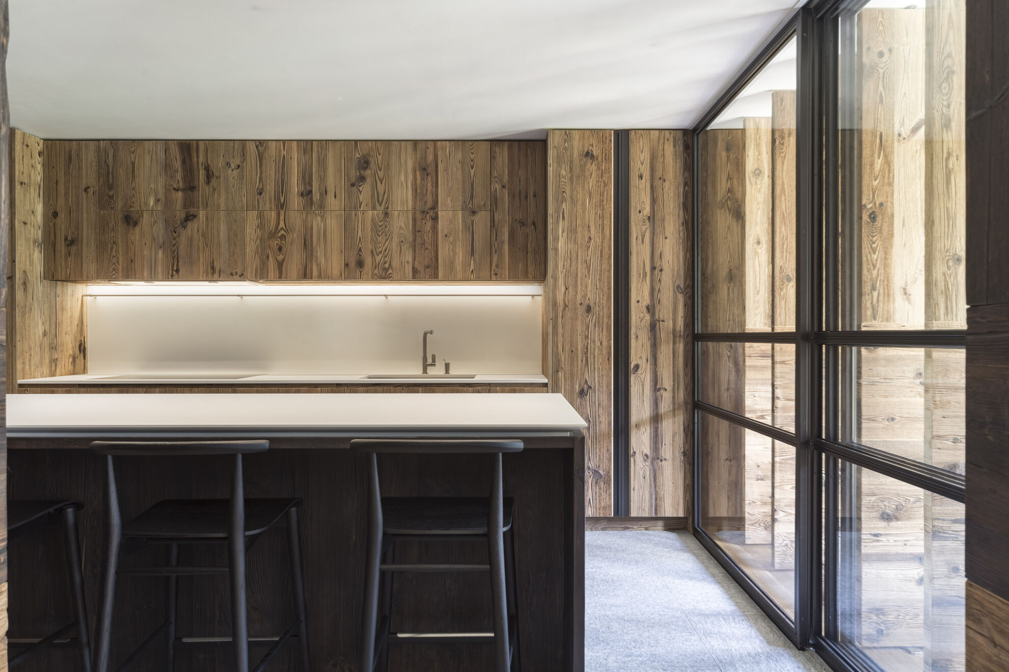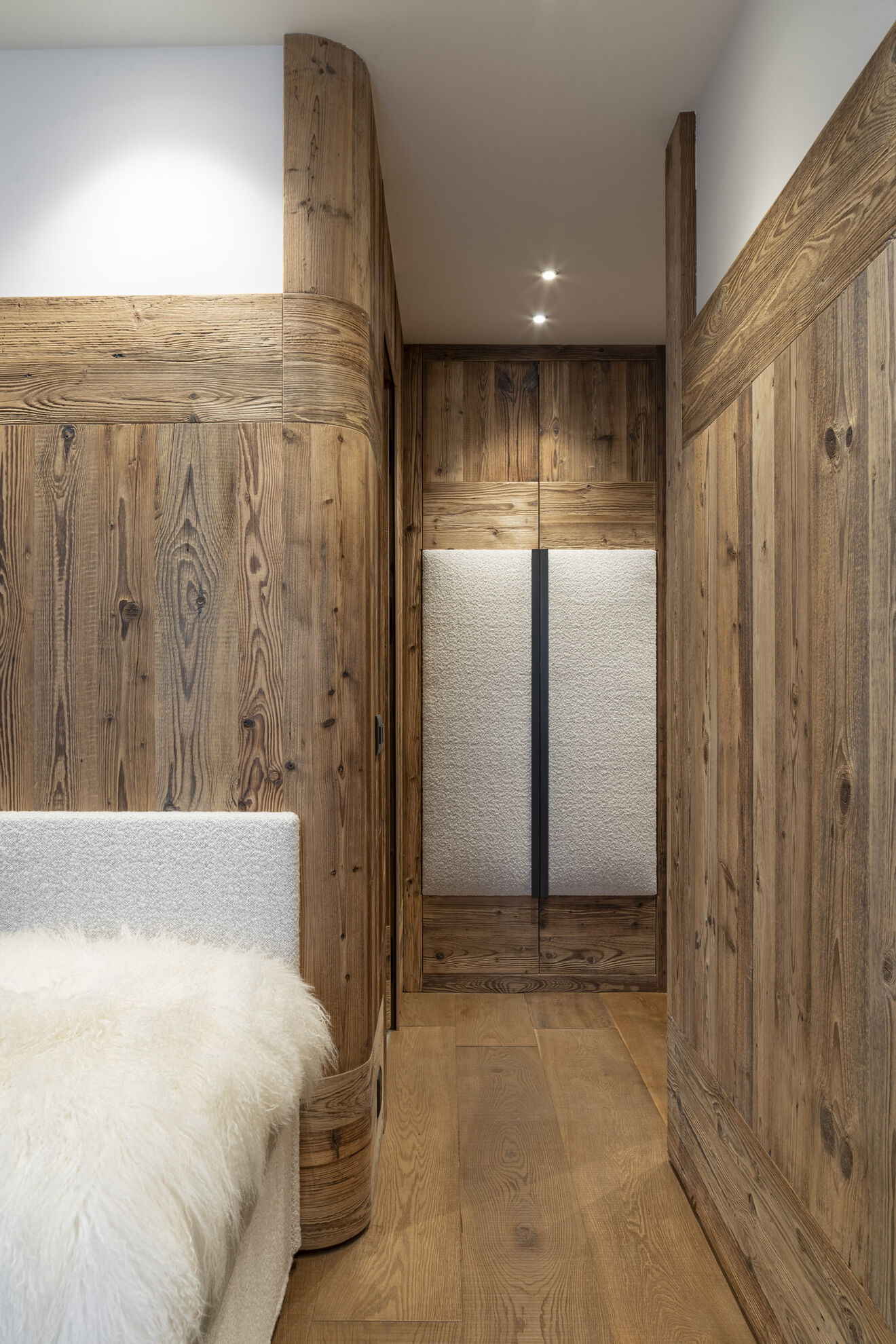 Realized in collaboration with the architect Studio Fanetti and Partners, this project emphasizes the combination of reclaimed wood and burnt wood, creating an elegant game of grains and contrasts. The use of metal elements, along with details such as decoration and frames, gives life to a space with authentic charm, perfectly integrated in the Engadin context. Each room reflects the attention to interior design, with tailor-made solutions that emphasize the raw material and mountain aesthetics.